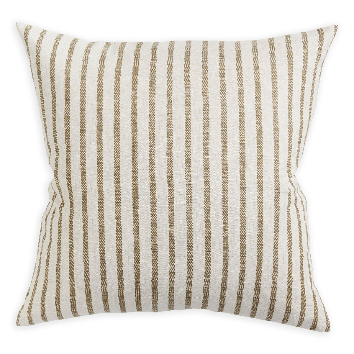 The Kythira design on this cushion reimagines the stripe with soft, stippled lines that evoke the feeling of woven threads or shifting sands. Hand printed on 100% linen by artisans.